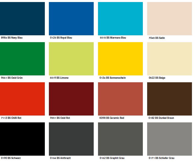 Die Farbauswahl für Ihr Bauvorhaben, egal ob Balkon oder Fassade ist oben links dargestellt. Im Original können die Farbtöne von der Bildschirmdarstellung abweichen.